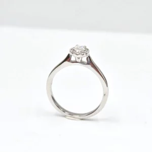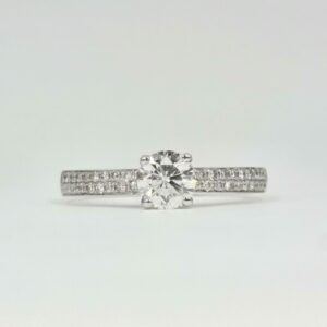 Référence Mohedano : 371A00032 Tour de doigt : 53 Type de pierres : diamant central + demi-tour diamants Poids du diamant central : 0.510ct Poids total diamants : 0.180ct Qualité diamants central : FG/VS Qualité diamants :F/VS Métal : Or blanc 750/000ème Poids métal : 2.500gr