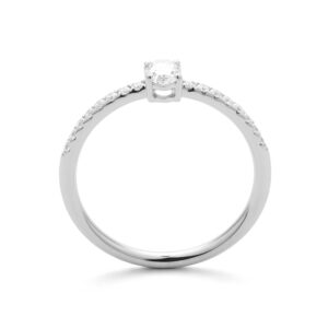 Référence Mohedano : 371A 00358 Catégorie : Bague/Solitaire Taille de doigt : 51 Type de pierres : 37 Diamants Poids diamant central : 0.10ct Poids des diamants : 0.20ct au total Qualité diamants : G/VS Métal : Or blanc 750/000 Poids : 2gr