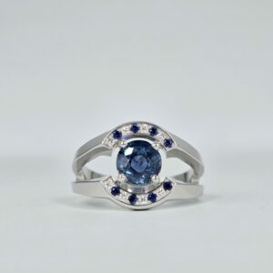 Référence Mohedano : 4160032 Tour de doigt : 53 Type de pierres : Saphirs, diamants et grenats tsavorite Poids du saphir central : 0.85ct 55*54mm Métal : 0r blanc palladié 750/000eme Poids métal : 3.68gr