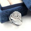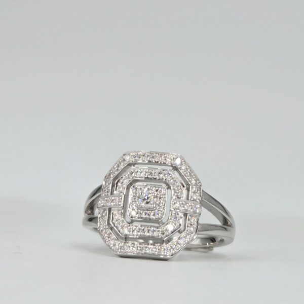 Sublimez votre style avec cette bague Art Déco au design géométrique et raffiné. Réalisée en or blanc palladié 750/000eme, elle est composée de 71 diamants serti grain sur un motif octogonal à plusieurs niveaux, évoquant l’architecture et le design des années 1930. Son corps fourche assure une tenue parfaite sur la main et crée un équilibre parfait entre structure et féminité.