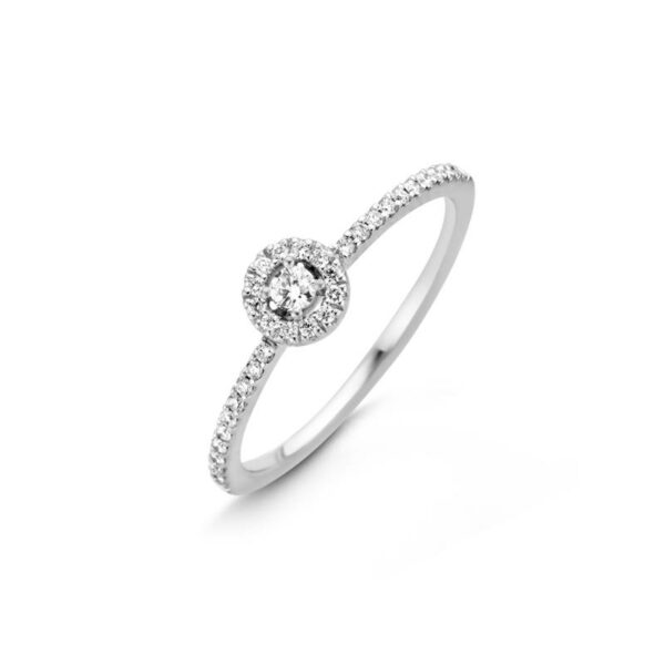 Référence Mohedano : 371A 00358 Catégorie : Bague/Solitaire Taille de doigt : 51 Type de pierres : 37 Diamants Poids diamant central : 0.10ct Poids des diamants : 0.20ct au total Qualité diamants : G/VS Métal : Or blanc 750/000 Poids : 2gr
