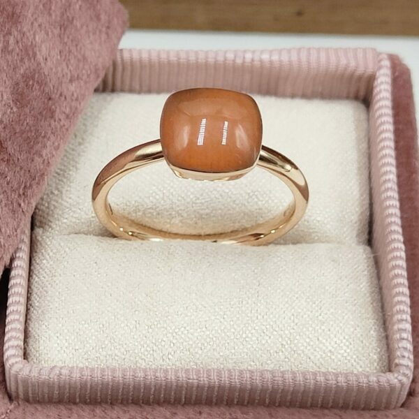 Le métal utilisé est de l’or rose 750/000ème, lui conférant une teinte chaleureuse et raffinée, mettant en valeur la beauté de la pierre.