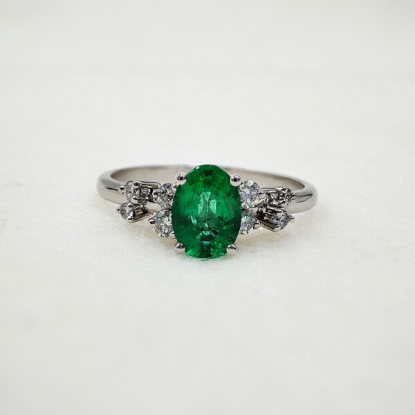 Bague Or Blanc Avec Emeraude Forme Ovale Serti 4 Griffes et Diamants