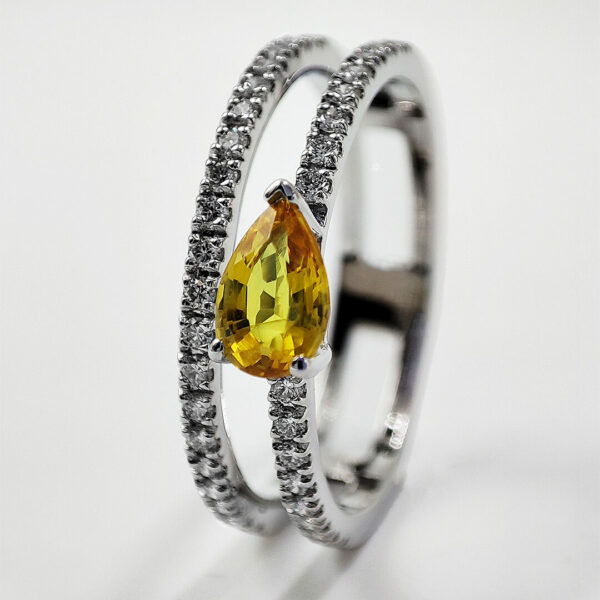 Bague Or Blanc Avec Saphir Jaune Forme Poire 6*4mm et Diamants