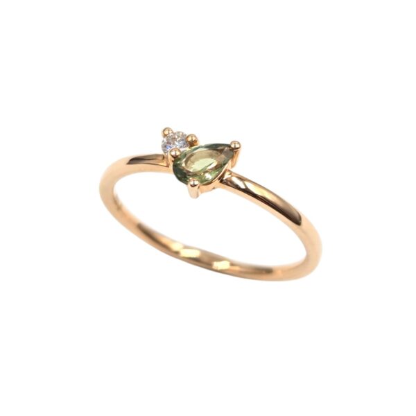 Délicate et lumineuse, cette bague en or rose à moins de 900€ met à l’honneur un jolie saphir vert forme poire et un petit diamant rond taille brillant. Disponible également en or jaune et or blanc sur commande, ce bijou est un présent idéal pour une douce occasion.