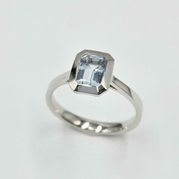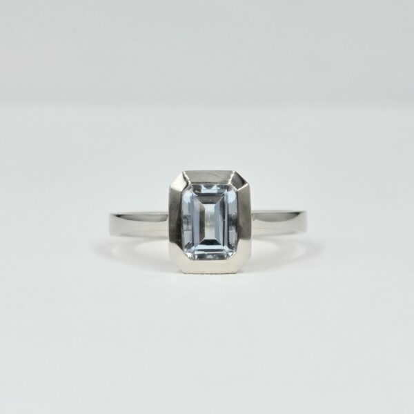 Au centre, une aigue-marine au bleu translucide et taillée en rectangle à pans coupés capte chaque lumière, comme un éclat de ciel figé dans l’instant. Le serti clos vient encadrer la pierre avec une élégance graphique, affirmant une personnalité discrète mais forte.