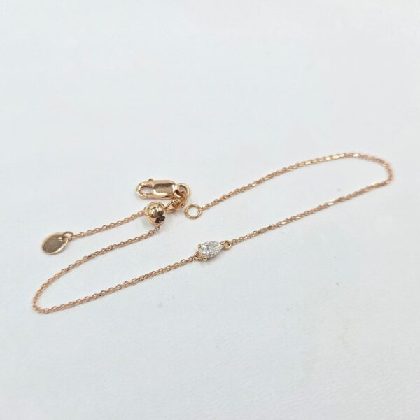 Finesse, délicatesse et éclat réunis dans ce bracelet en or rose 750/000ème. Au centre, un diamant forme poire aux feux intense et captivant. Laissez vous séduire par ce bijou délicat et précieux.