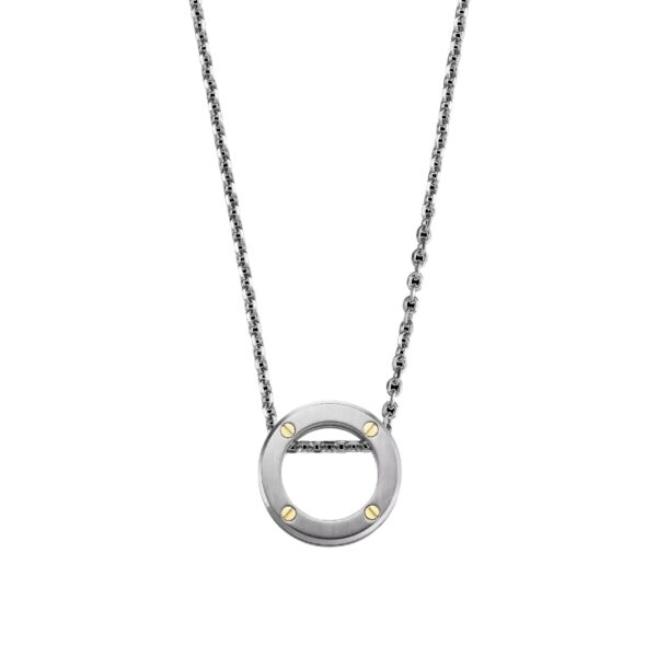 Le Collier NEWPORT DUO en acier brossé 316L, rehaussé de vis en or jaune 375, illustre l’élégance équilibrée et la précision de la Maison HERBELIN. Son pendentif circulaire, inspiré de l’univers horloger, joue sur les contrastes de matières pour un effet à la fois discret et sophistiqué.