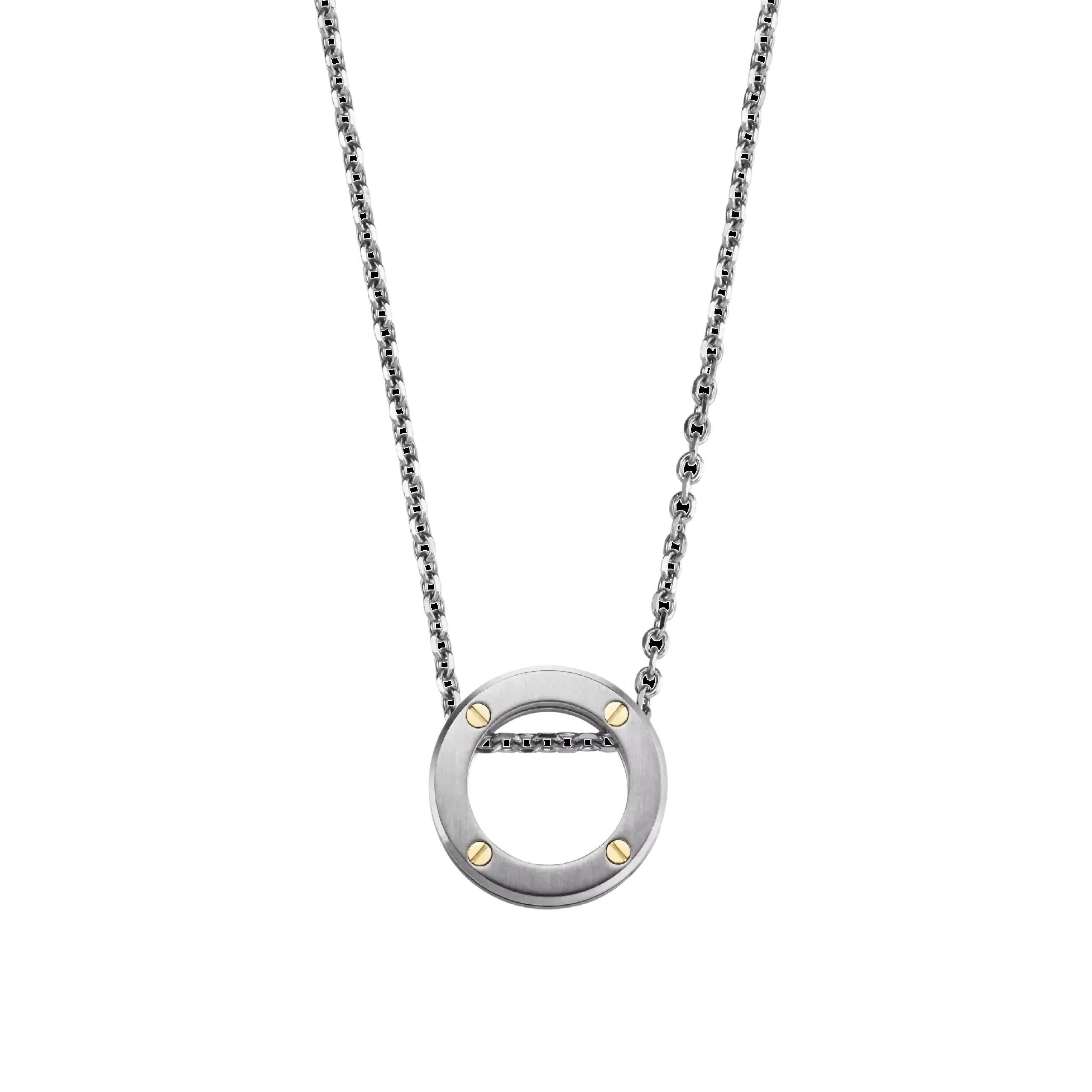 Le Collier NEWPORT DUO en acier brossé 316L, rehaussé de vis en or jaune 375, illustre l’élégance équilibrée et la précision de la Maison HERBELIN. Son pendentif circulaire, inspiré de l’univers horloger, joue sur les contrastes de matières pour un effet à la fois discret et sophistiqué.