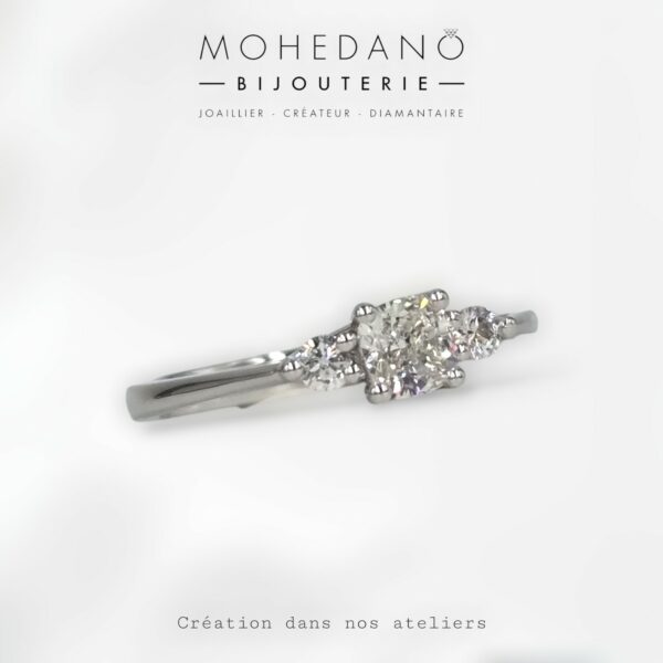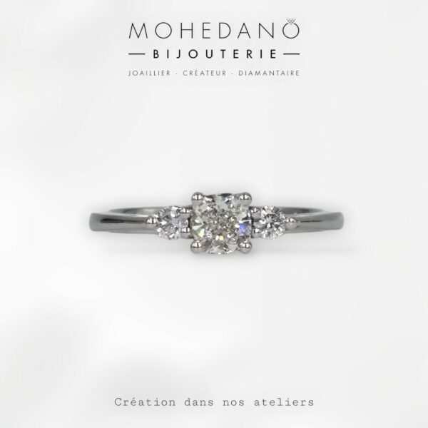 « . Nous avons choisi chaque pierre pour que ce bijou reflète notre travail et anime votre cœur. Au centre, 1 diamant taille coussin 0,44 ct certifié GIA couleur G pureté VVS, et sur les côtés, deux diamants ronds taille brillant pour 0,11 ct total.