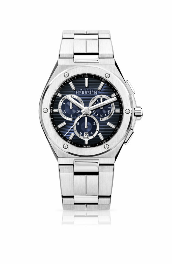 Cap Camarat . . . un lieu évocateur de la French Riviera qui a inspiré l’Atelier d’Horlogerie Française Michel Herbelin pour baptiser sa nouvelle collection de montres. Rythmé par un mouvement quartz, ce modèle au design sculpté et racé, arbore un fond bleu frappé à l’horizontal qui évoque les marinières portées initialement par les hommes de mer. Marquée de trois compteurs ce chronographe offre une allure chic et sportive.