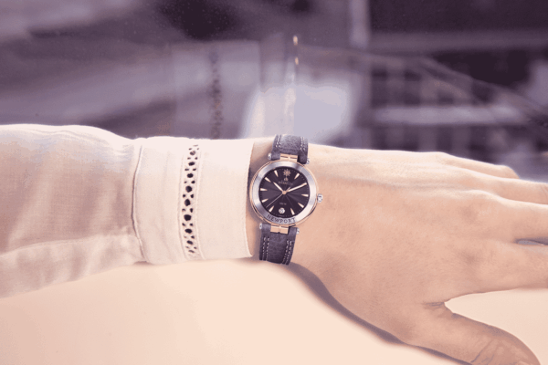 L’aspect bicolore du cadran et de ses attaches en acier et PVD or jaune fait d’elle un garde-temps authentique.