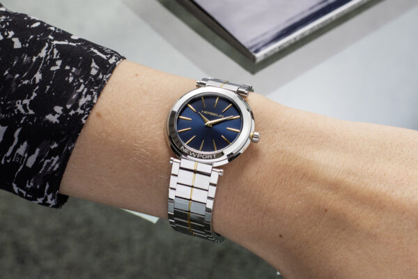 Emblématique de la maison française, Newport arrive métamorphosée et arbore une silhouette fine et épurée. D’une épaisseur de seulement 7,30 mm c’est une première pour la Newport. Le boîtier en acier inoxydable de 32 mm de diamètre reste fidèle aux codes historiques par ses attaches centrales et sa couronne gravée d’une roue marine. Découpé en trois facettes minutieusement ciselées, sa finition polie sculpte la lumière. Newport Slim a été dessinée, conçue et assemblée dans les ateliers Michel Herbelin en France.