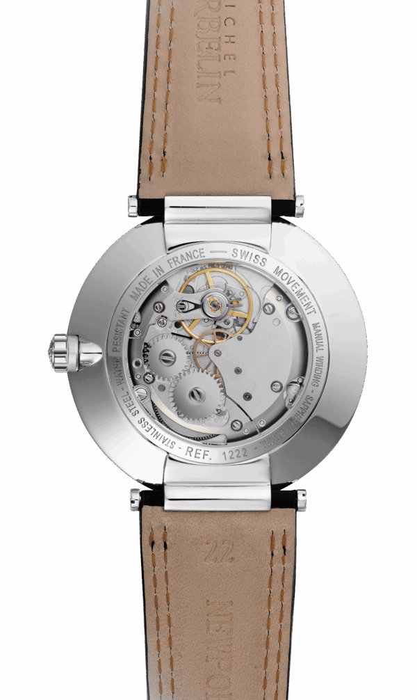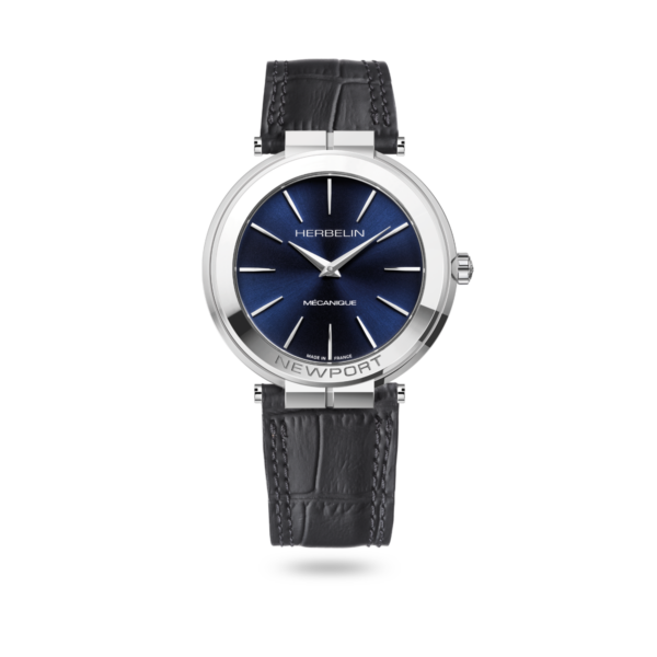 Emblématique de la maison française, Newport arrive métamorphosée et arbore une silhouette fine et épurée. D’une épaisseur de seulement 7,30 mm c’est une première pour la Newport. Le boîtier en acier inoxydable de 42 mm de diamètre reste fidèle aux codes historiques par ses attaches centrales et sa couronne gravée d’une roue marine. Découpé en trois facettes minutieusement ciselées, sa finition polie sculpte la lumière. Rythmée par un mouvement mécanique à remontage manuel, cette montre est habillée d’un bracelet en cuir façon alligator. Newport Slim a été dessinée, conçue et assemblée dans les ateliers Michel Herbelin en France.