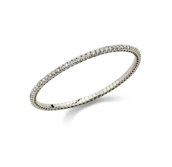 Élégance et technicité pour cette rivière de Diamants extensible. Pas de fermeture, un système innovant permettant d’enfiler son bracelet sans encombre et de l’avoir bien ajusté à son poignet.