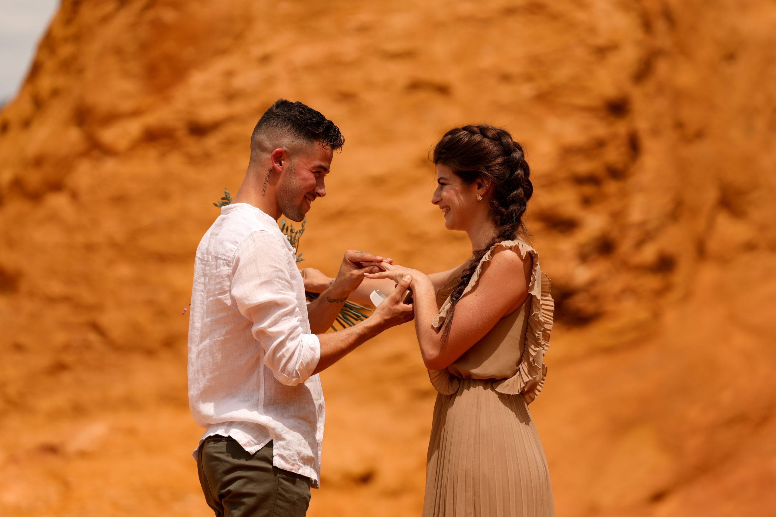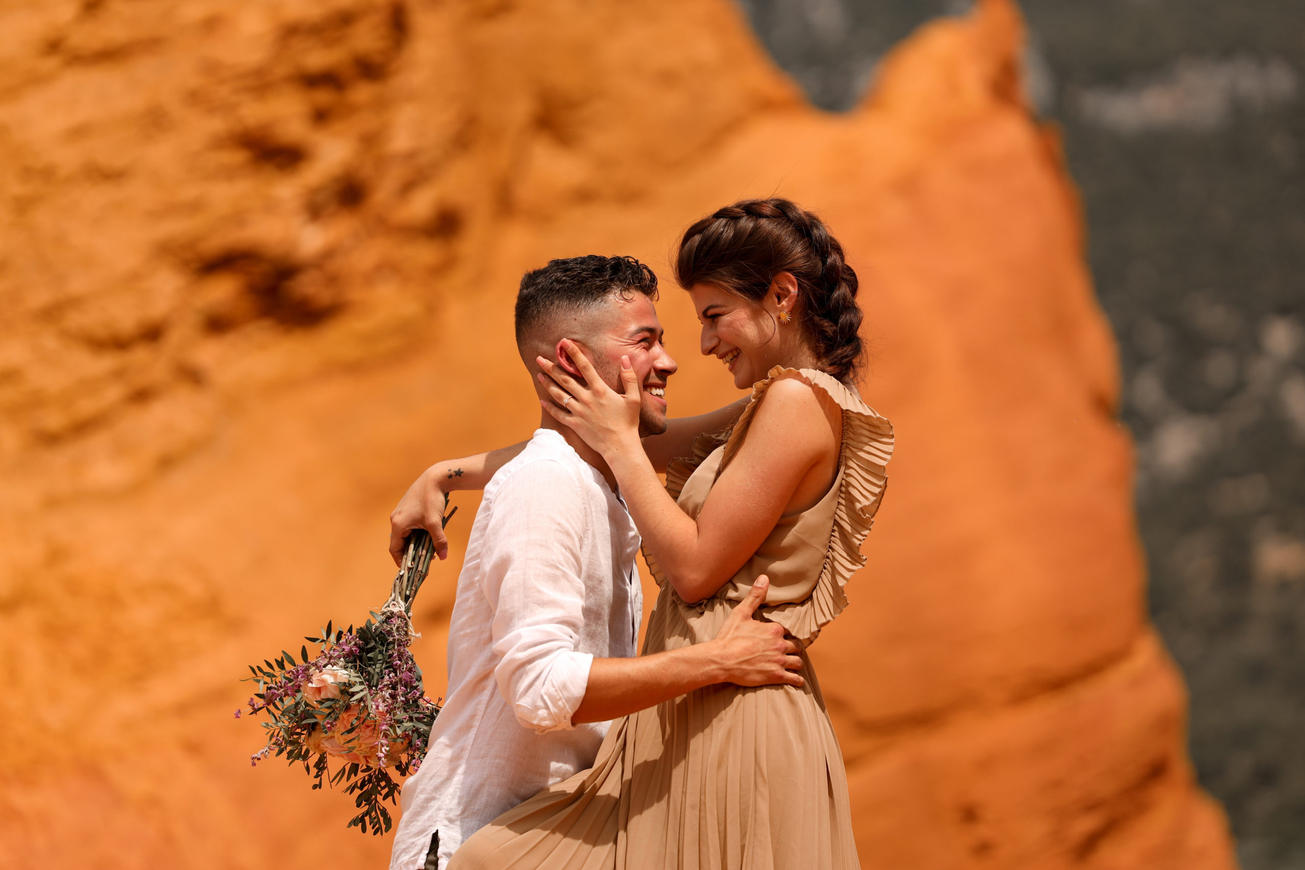 Direction les Terres rouges du Colorado Provençal pour immortaliser la demande en mariage. Un paysage splendide aux teintes ocres et une lumière chaleureuse forment l’ensemble parfait pour capturer ce moment magique et unique.